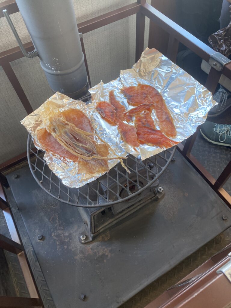 ・だるまストーブでスルメや鮭とばを焼き食べる