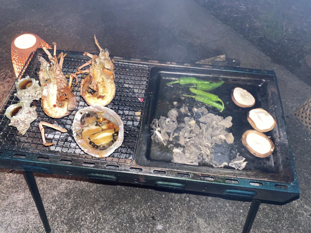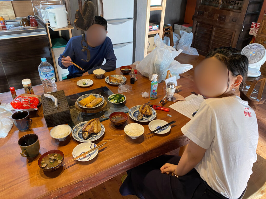 夕食は家から持参した肉と黒潮市場で海鮮を調達し肉&海鮮バーベキューを楽しみ、朝食は焼き魚や卵焼き味噌汁などを自分たちで用意しました。