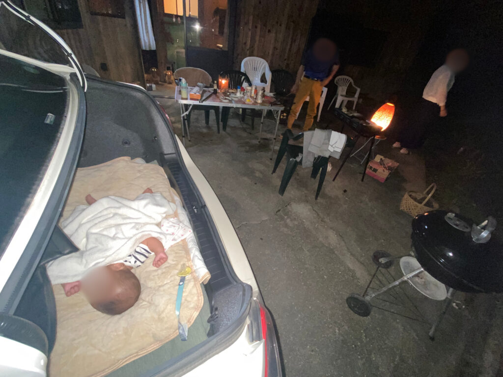 ↑満点の星空の中トランクルームで眠る我が子とBBQを楽しむ大人