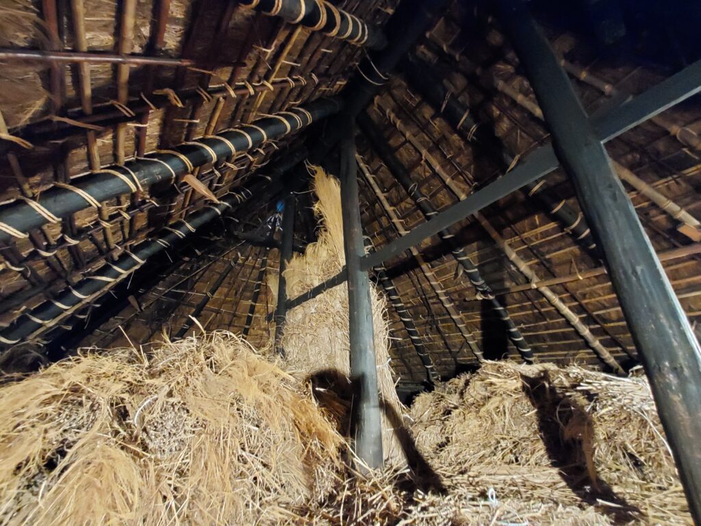 梯子をかけて登ってみるとトタンの茅葺き屋根。まるでトトロやハイジの世界。
